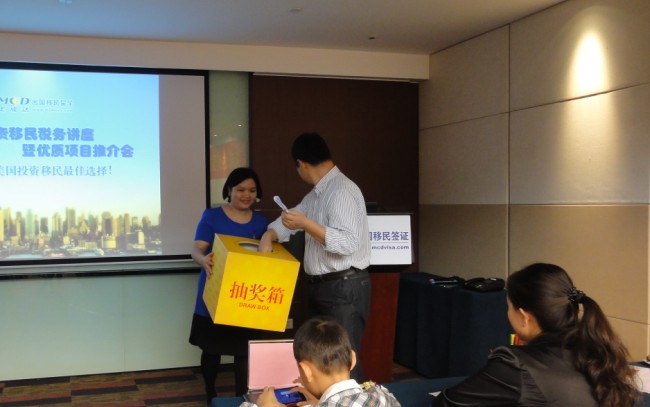 抽奖环节由美成达已获得美国移民局I-526批准函的成功客户张先生来抽奖,意在延续张先生的好运气,同时由美成达顾问为幸运客户送上精美礼品。